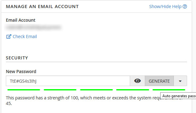 - Masukkan password baru atau klik tombol generate untuk membuat password yang lebih aman untuk email account tersebut.